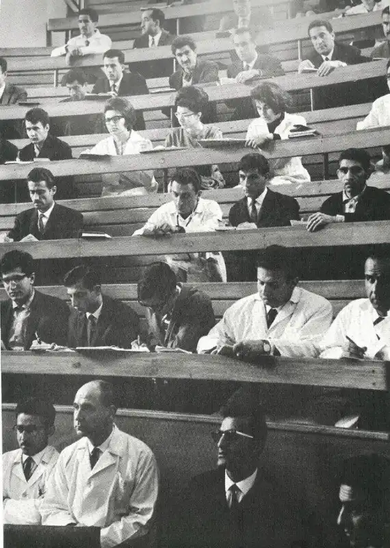 Студенты университета в 1970 году. Хотя религиоведение и было популярным предметом, лекции по математике, астрономии, медицине и литературе также посещались большим количеством учащихся. На сегодняшний день в университете Тегерана обучается около 35000 студентов дневной и заочной форм обучения.