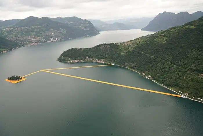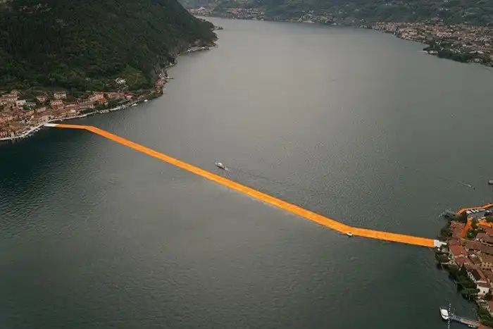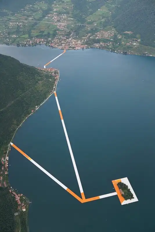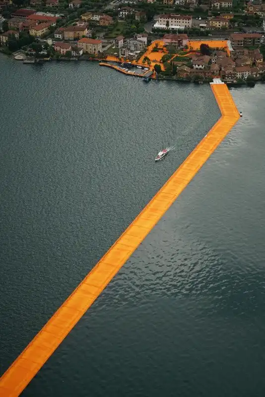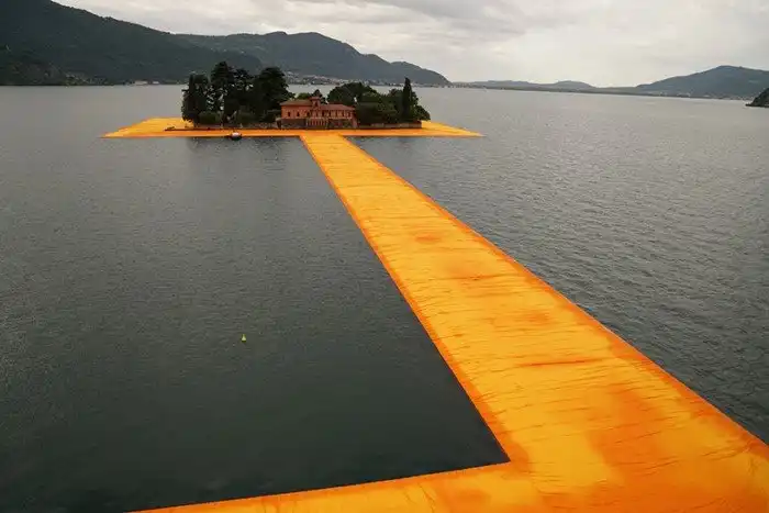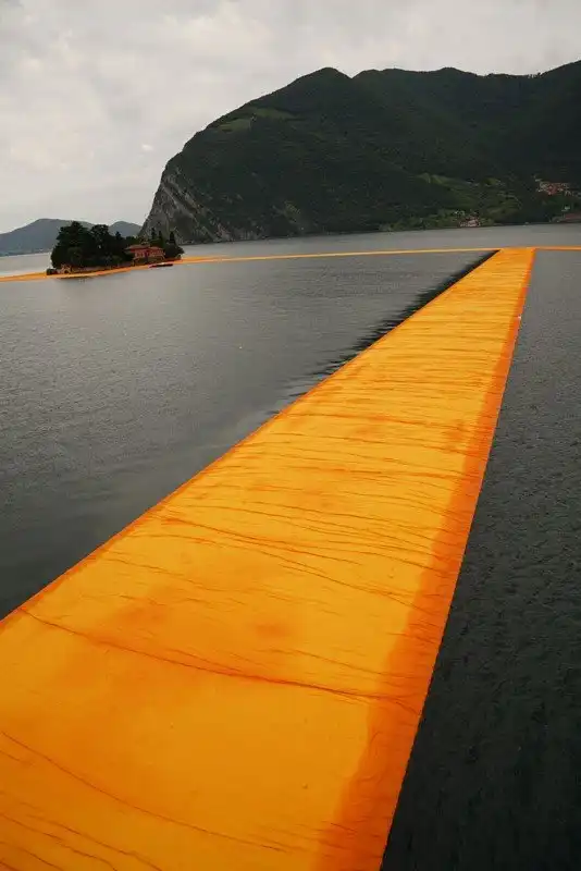 Пирс на понтонах, является инсталляцией задуманной еще в 1970 г годах дуэтом французских инсталляторов Кристо и Джин-Клод. Оранжевой тканью покрыта дорога и на суше, и на воде, создавая ощущение безпрерывного пути. По различным причинам задуманное исполнилось только в этом году.