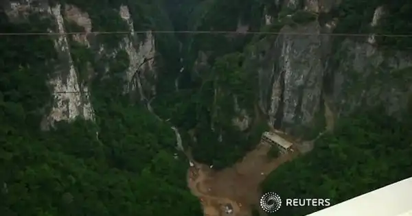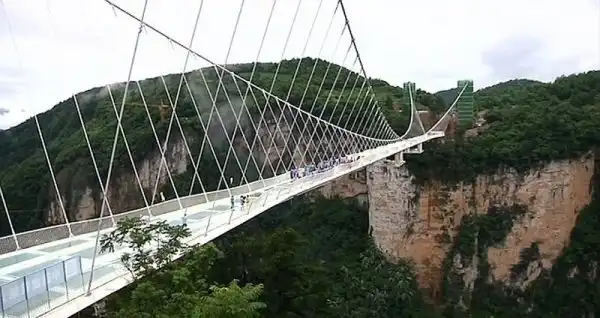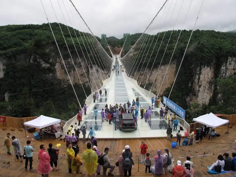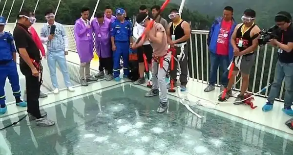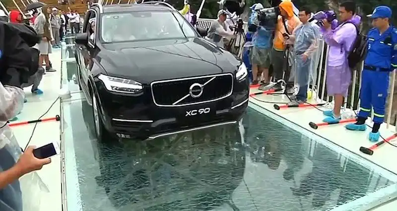 Стеклянный мост, протяженностью 430 метров, завис на высоте 300 метров на горе Юнтай в провинции Хэнань. Это самый длинный стеклянный мост в мире. Он откроется 20 сентября, а пока мост решили проверить на прочность. По нему били кувалдами и проехали на настоящем автомобиле. Это было сделано, что бы успокоить общественность после того, как был закрыт аналогичный мост в этой же провинции из-за треснутой секции в октябре прошлого года.