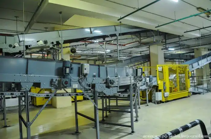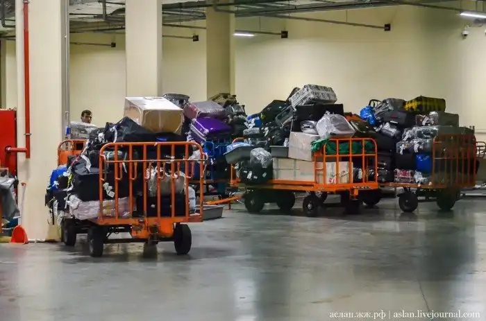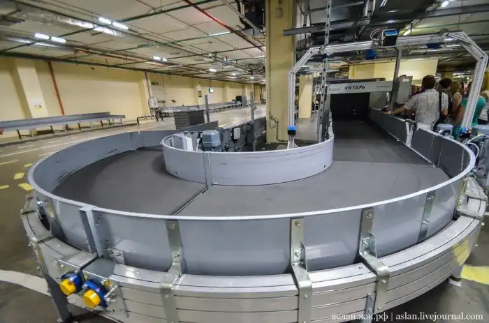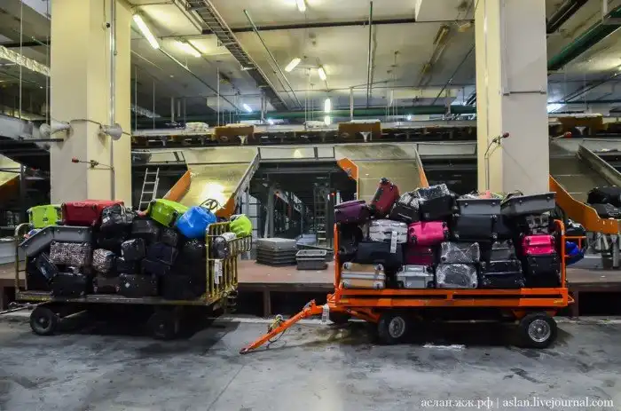 После спуска вниз багаж попадает в огромный механизм, который быстро и четко распределяет все чемоданы и сумки на нужные рейсы. Правильное название механизма — автоматическая система сортировки багажа (АССБ). Общая протяженность линий системы — около 3 километров.