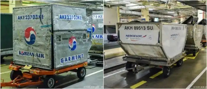 Из склиза багаж перегружается в контейнеры или тележки, которые отвозят к борту самолета. Использование контейнеров ускоряет процесс погрузки и выгрузки, но выбор способа транспортировки остается на усмотрение авиакомпании.