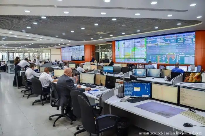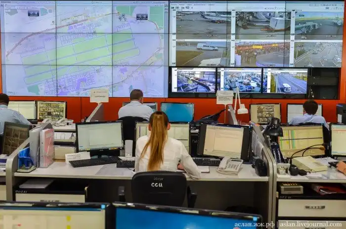 Далее наш путь лежит в Центр управления аэропортом – ЦУА, открытый в 2011 году. Здесь рабочее место диспетчеров, которыми контролируется всё, что происходит в Шереметьево. При его создании учитывался опыт ведущих аэропортов мира, таких как цюрихский и лондонский.