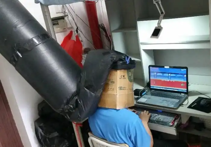 Китайский студент из города Наньнин собрал необычное приспособление, чтобы спастись от сигаретного дыма, которым постоянно наполняли его комнату курящие соседи. Несмотря на то, что выглядит данный девайс довольно громоздко и, как минимум, странно он все же помогает дышать чистым воздухом.