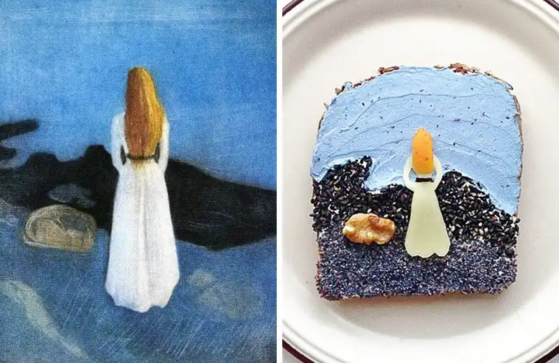 Норвежская художница Ида Скивенес не просто любит позавтракать, ей нравится придумывать что-то особенное, такое, что будет интересно рассматривать. Поэтому-то она создает из хлеба и других обычных продуктов «копии» известных во всем мире картин. Затем фотографирует получившееся и съедает.