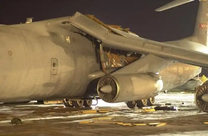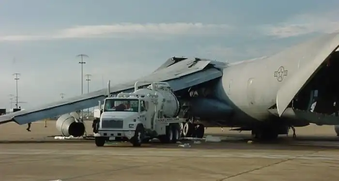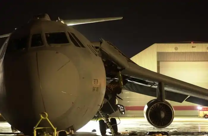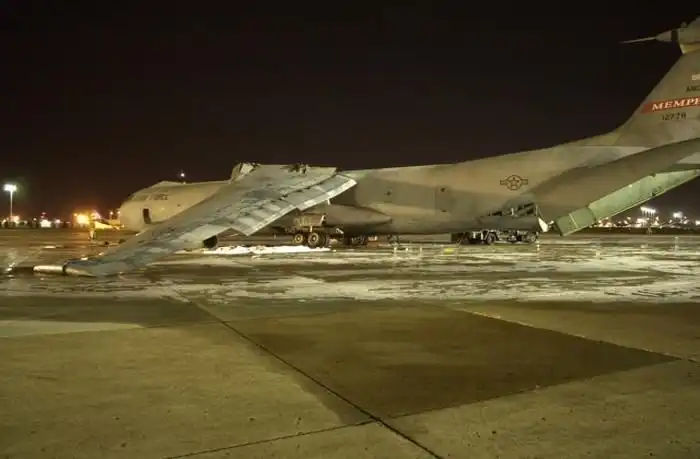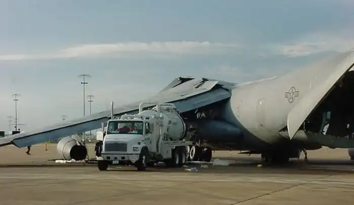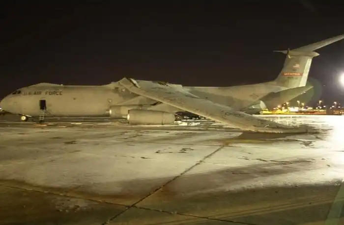Рзличного рода инциденты, произошедшие по глупости, свойственны не только нашей армии. На этих снимках поврежденный самолет Lockheed C-141 "Starlifter" ВВС США, который по глупости обслуживающего персонала аэропорта Мемфиса лишился крыла. Произошло это 20 декабря 2001 года, когда самолет готовили к вылету на авиабазу в Германии. Обнаружив утечку во втором баке, заправщики заполнили бак сжатым воздухом, чтобы по звуку определить место утечки. После того, как пробоина была найдена, ее залатали, однако воздух из бака выпустить забыли. Само собой, в момент заправки бак не выдержал напряжения и лопнул, снеся при этом еще и силовую конструкцию крыла.