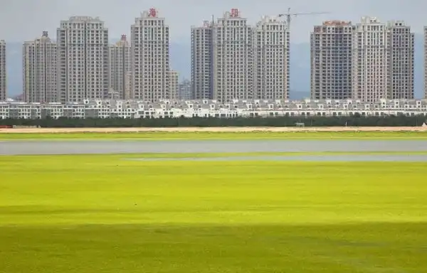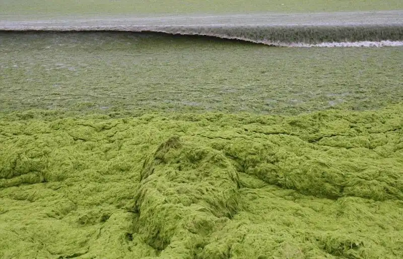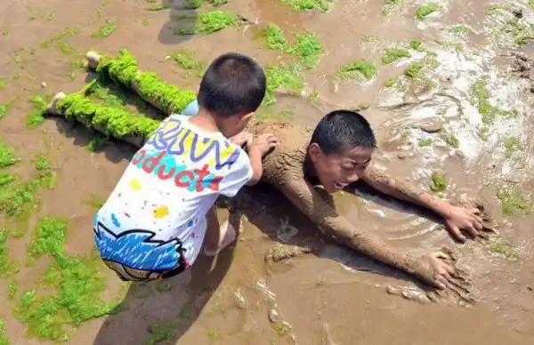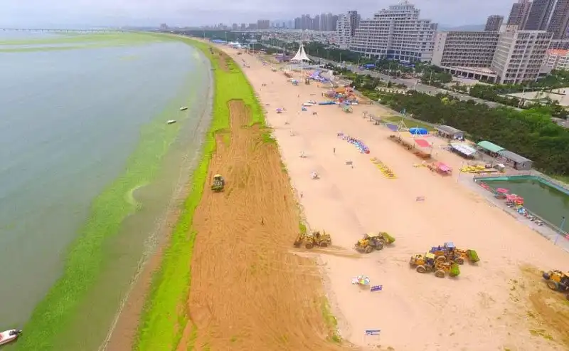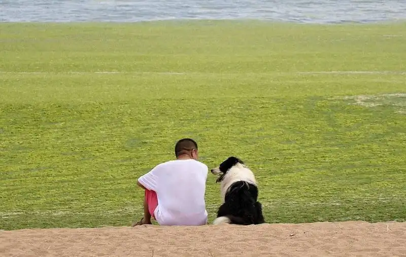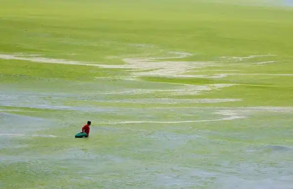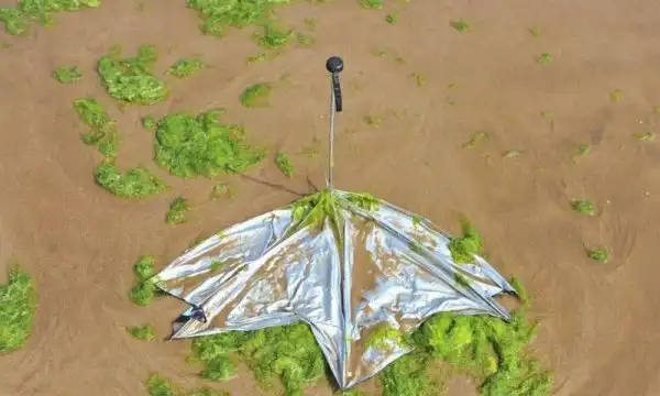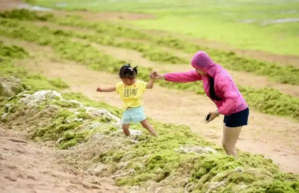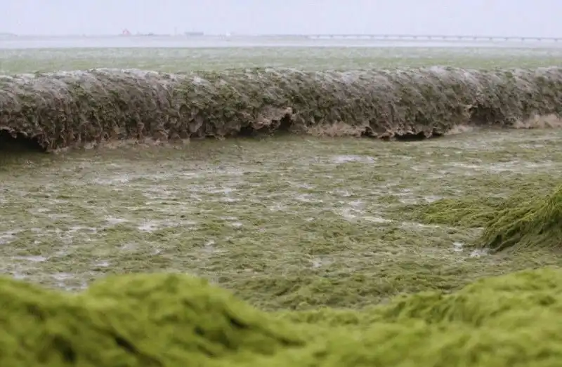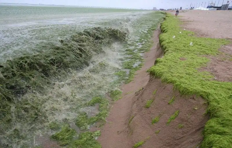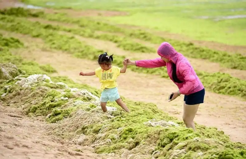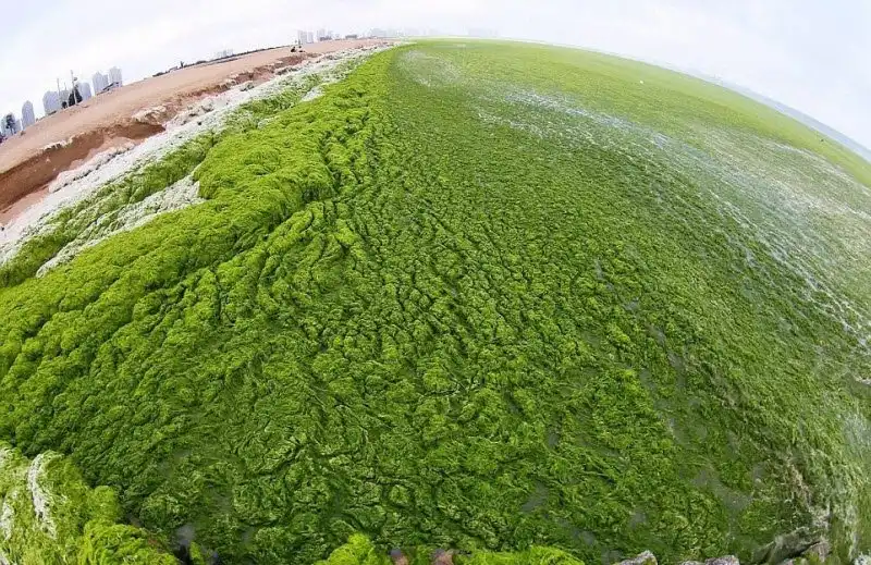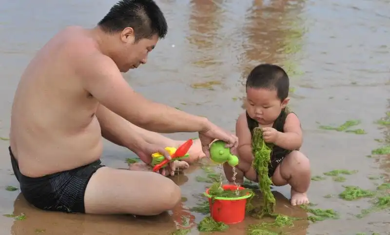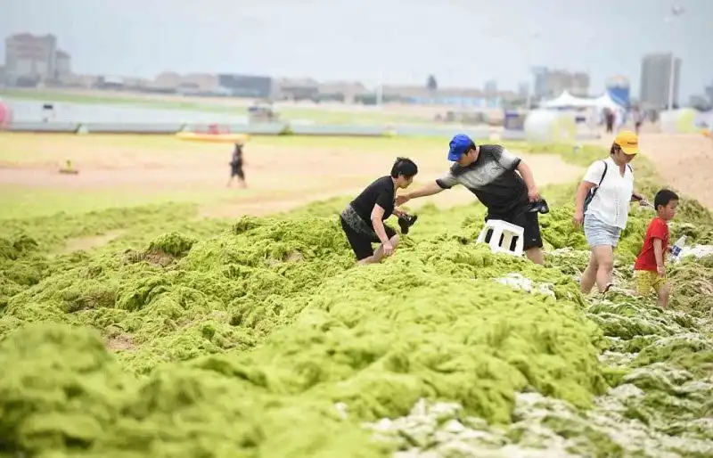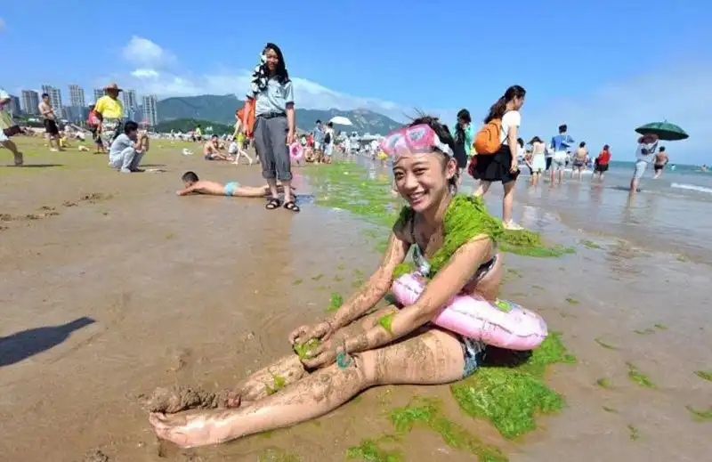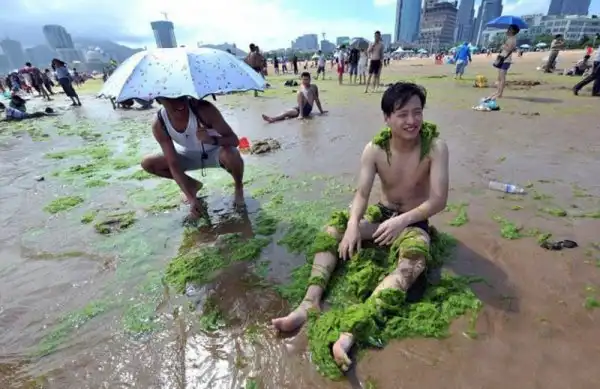На пляже Шилаорен в Циндао, Китай, множество отдыхающих, и это не смотря на то, что сейчас период цветения водорослей. Кристально чистая вода превратилась в зеленую жижу. Однако это нисколько не огорчает отдыхающих, они используют водоросли для защиты кожи от солнца. Эти водоросли безвредны для человека, но морские обитатели находятся в опасности, так как растения поглощают кислород из воды.