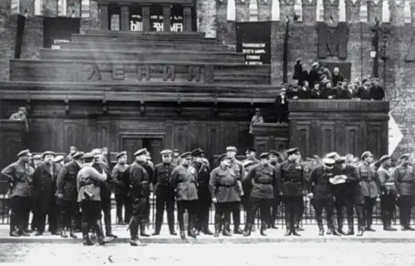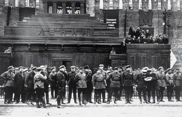 Советское руководство на фоне еще деревянного мавзолея