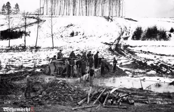 При попытке преодолеть вязкий участок грунта танк безнадежно застрял. Спасательная операция с привлечением личного состава 7-го запасного танкового батальона завершилась успешно, после чего танк еще долго очищали от грязи.