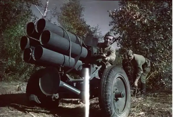 Советские солдаты осваивают немецкий реактивный 150-мм миномёт «Nebelwerfer 41».