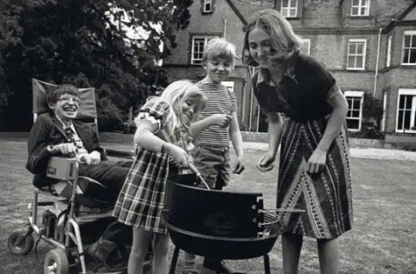 Стивен Хокинг с первой женой Джейн Уайлд и их детьми Робертом и Люси жарят барбекю. 1977 год.