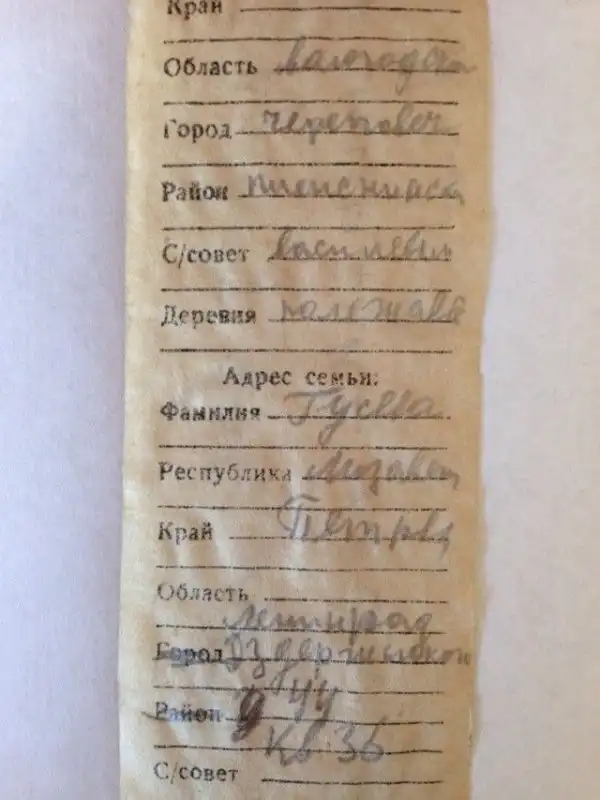 В Кировском районе Ленинградской области поисковики обнаружили останки красноармейца, при котом был найден жетон военнослужащего («смертный медальон»). Благодаря записке в медальоне была установлена личность бойца: Рыжов Ник… Сергеевич, уроженец Шекснинского р-на, Васильевского с/с, д. Полежаева. В графе «адрес семьи» было указано: Гусева Лизавета Петровна, г. Ленинград, ул. Дзержинского, д.44, кв. 36. На обратной стороне записки обнаружено обращение погибшего солдата, пролежавшее в земле 74 года.