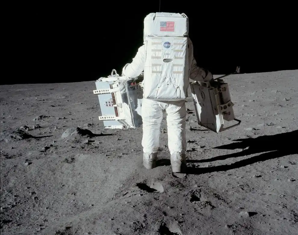 Астронавт Базз Олдрин несет оборудование для экспериментов