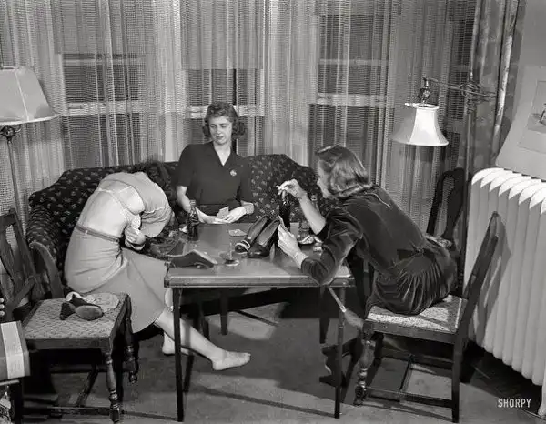 Дамы коротают вечер распитием Кока-Колы и игрой в карты на раздевание. Детройт, 1941 год