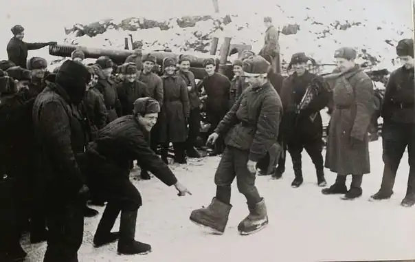 Советские солдаты смеются над "обувью", использовавшейся немцами для утепления в условиях суровой зимы, Сталинград, февраль 1943 года