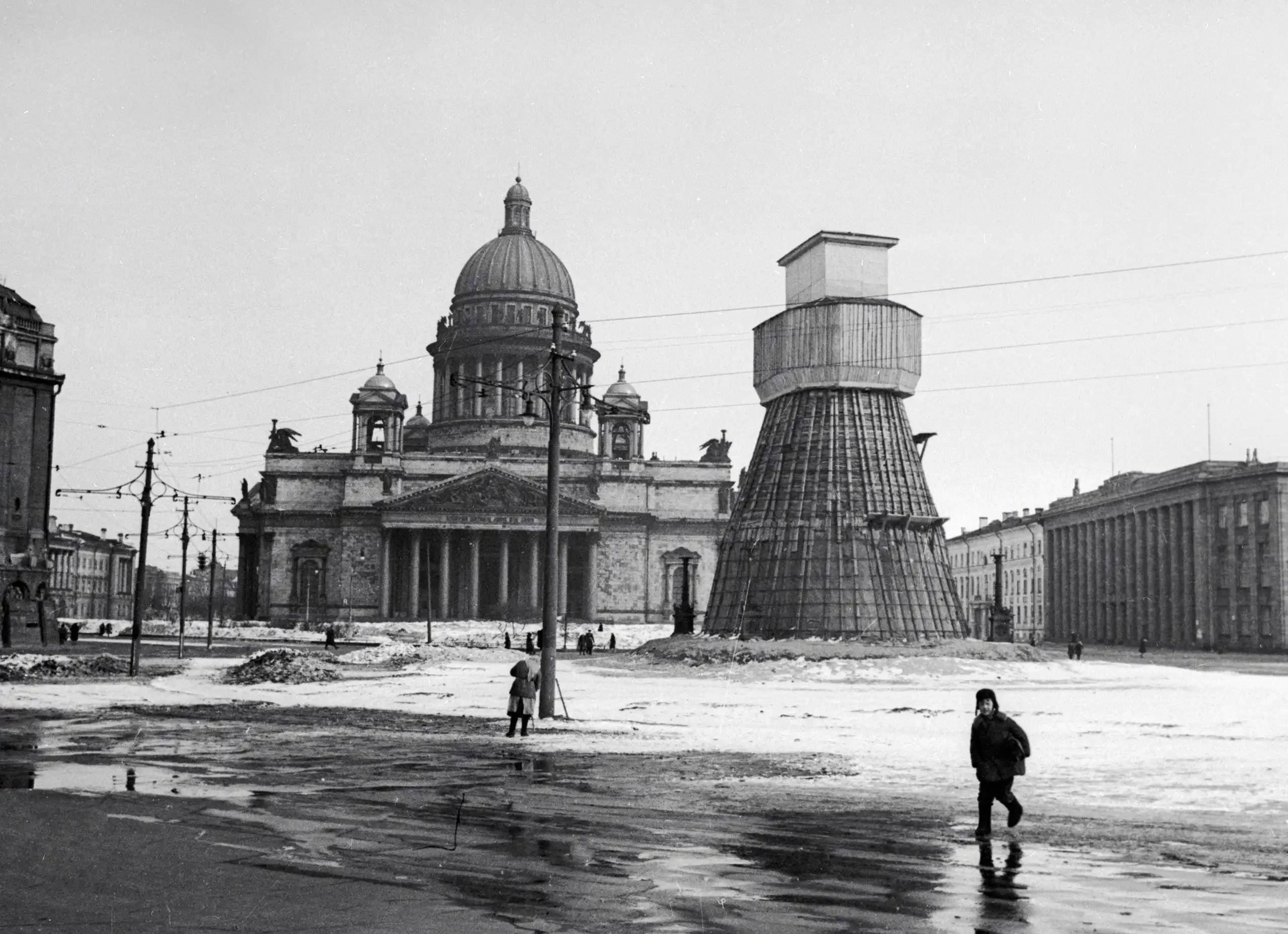 Исаакиевская площадь в блокадном Ленинграде. В кадре на дальнем плане Исаакиевский собор и в центре статуя памятника императору Николаю I, помещенная в защитный короб. Ленинград. 1941-1944 годы.