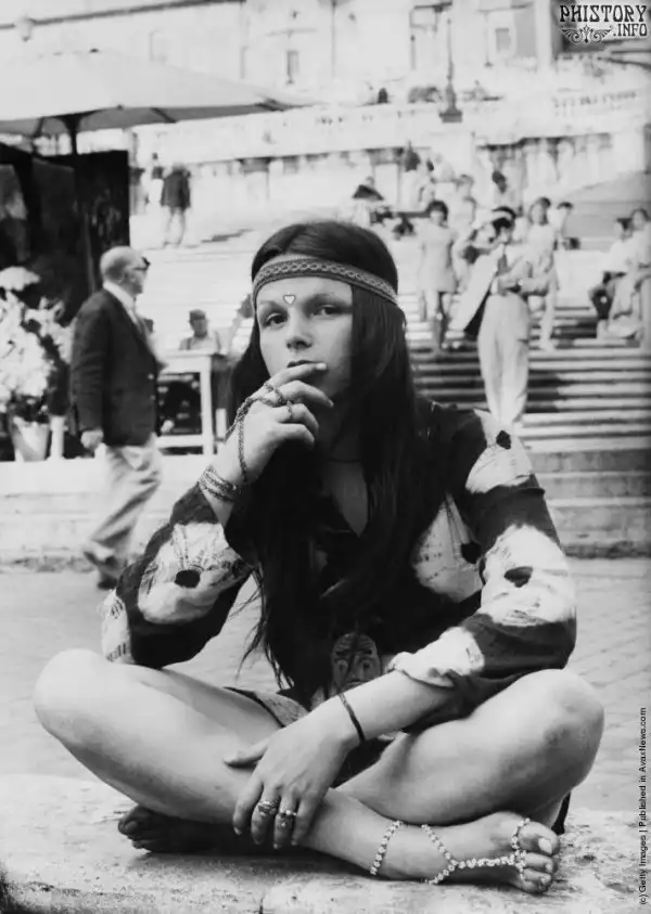 Девушка-хиппи сидит на Испанской лестнице. Рим.1970 год.