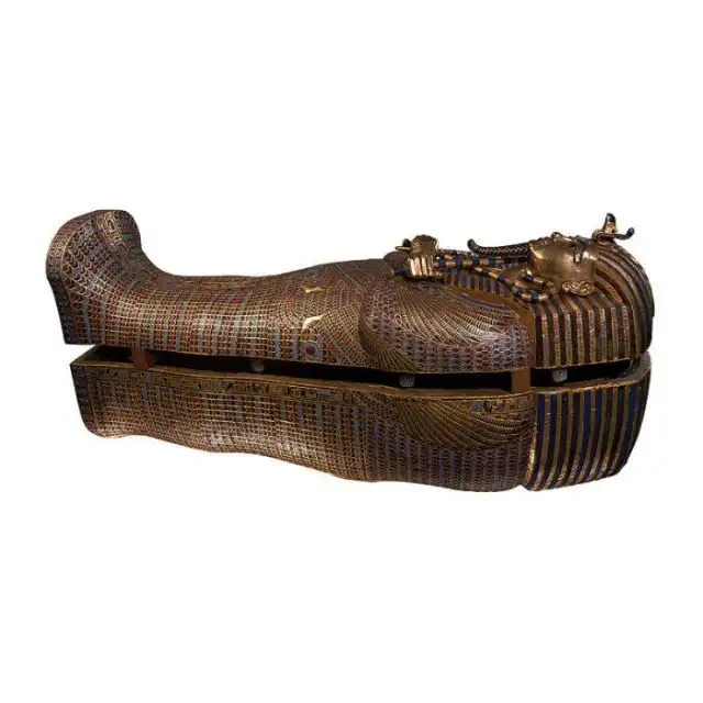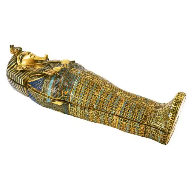 Деревянный гроб покрыт листовым золотом и инкрустирован полудрагоценными камнями и разноцветным стеклом.