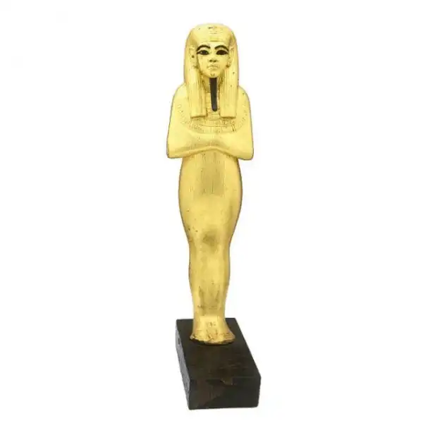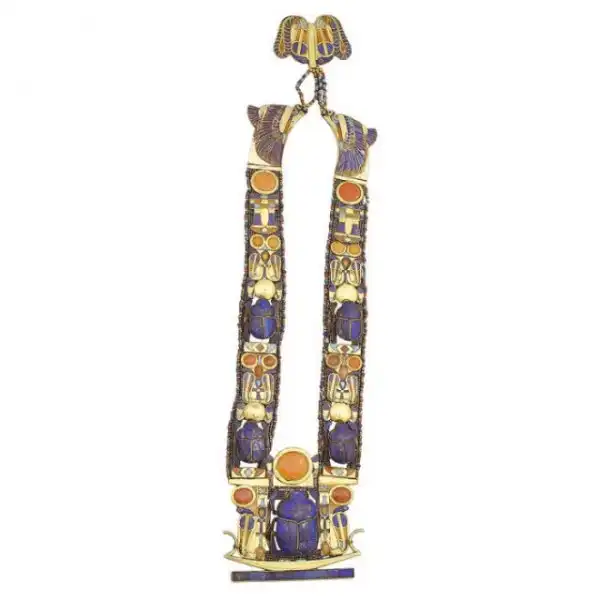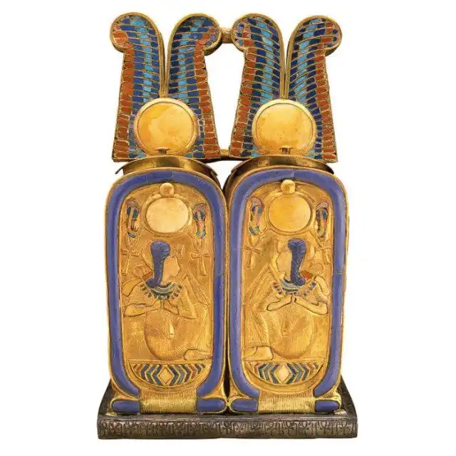 Эта диадема поддерживала парик фараона во время церемоний, а изображенная в центре богиня Нехбет, должна защитить его лоб в будущей жизни.