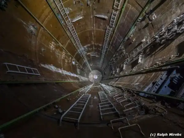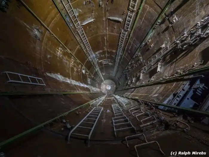 Расчехляю штатив и начинаю фотографировать шахту, а, тем временем, с других сторон появляются коллеги, спустившиеся другими проходами вокруг оголовка. Час я развлекаюсь с постановкой освещения и ракурсов. И если ,при взоре сверху-вниз, выходят относительно неплохие кадры, то вид снизу-вверх мне откровенно не нравится. Призываю на помощь коллегу.
