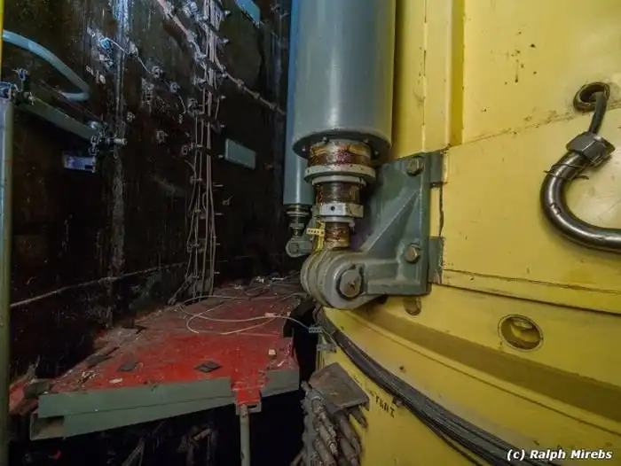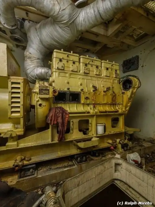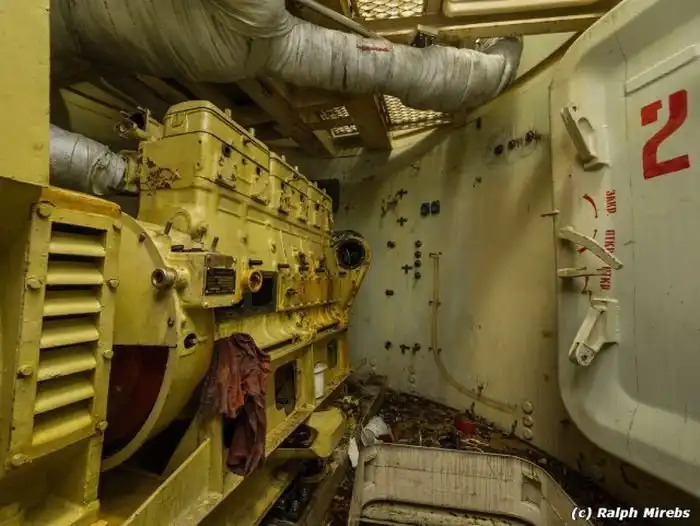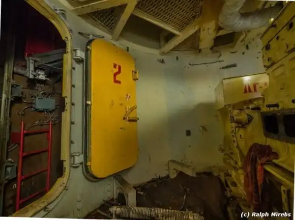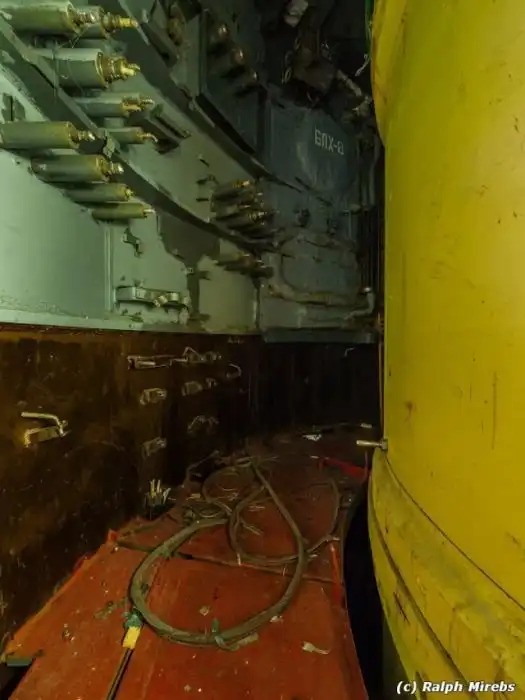Вообще, УКП дошел до нас в весьма хорошем состоянии. Да, из него изъяли всю электронную аппаратуру, срезали крышки люков, внутренние лесенки и куда-то умыкнули модные кресла. Но, при этом, сохранили весь остальной чермет, включая полные меди дизеля, посеребрённые провода соединений и позолоченные разъемы.
