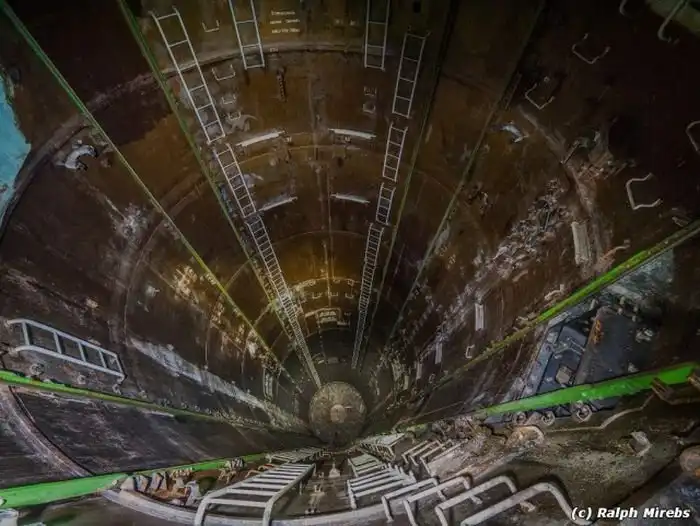 Вниз, на самое дно шахтного стакана, идет несколько открытых лесенок, но спускаться по ним я не решаюсь. Вот если бы пришлось по ним подниматься – не вопрос, но от спуска меня что-то удерживает. Возможно, забытые наверху перчатки.