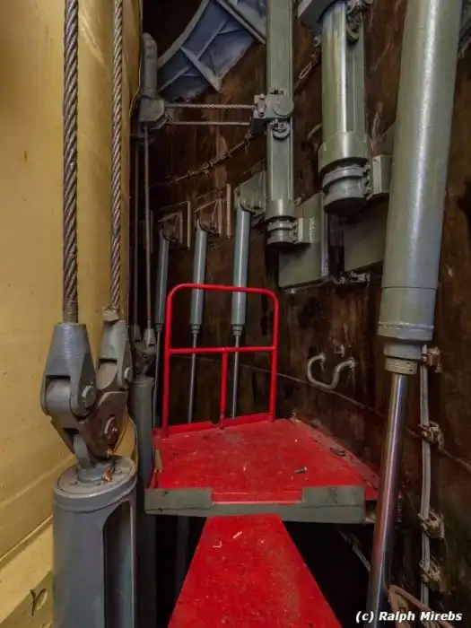 В УКП достаточно тесно, как внутри контейнера, так и в пространстве между ним и стенками шахтного стакана. Обычным способом перемещения между уровнями был лифт, но ныне он стоит обездвиженный на самом низу. Приходится лазать по боковым лесенкам. Красные – пожарные проходят по всей глубине шахты. Желтые соединяют различные технологические ярусы. Коллега спускается в самый низ, а я остаюсь наверху и начинаю осмотр/съёмку.