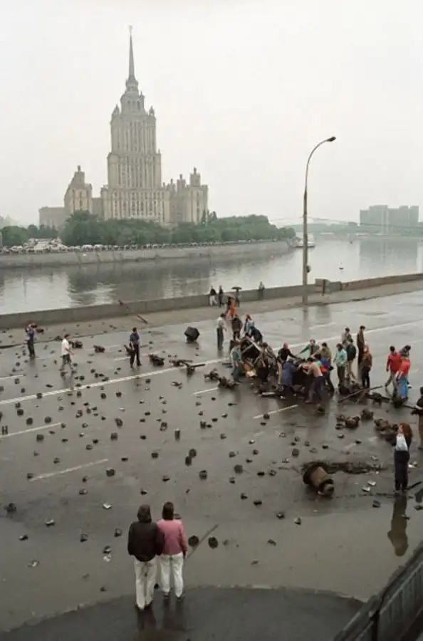 Москвичи строят баррикады на подступах к зданию Верховного Совета РСФСР во время путча ГКЧП