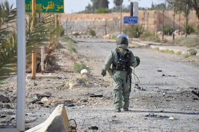 Освобожденная от боевиков ИГИЛ Пальмира по-прежнему остается буквально напичканной минами и бомбами, которые обезвреживают саперы. Недавно пресс-служба Инженерных войск опубликовала снимки работы российских саперов и саперов Международного противоминного центра.