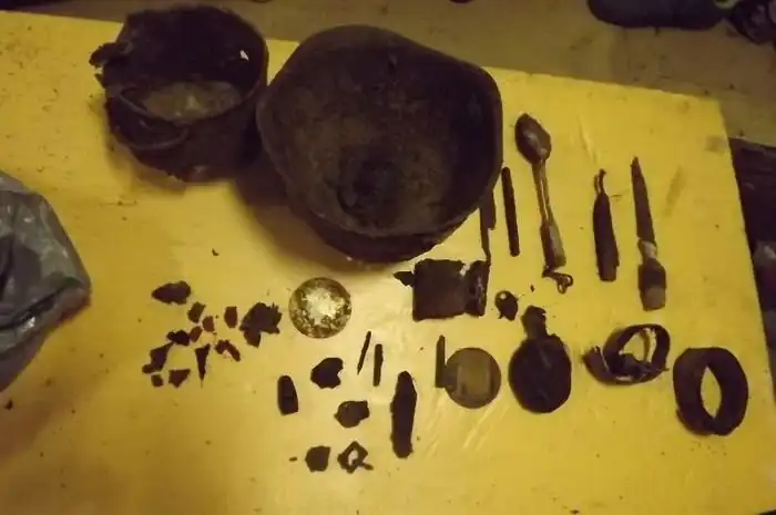 Каска, котелок, ложка и другие предметы, поднятые рядом с павшим.