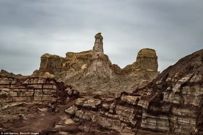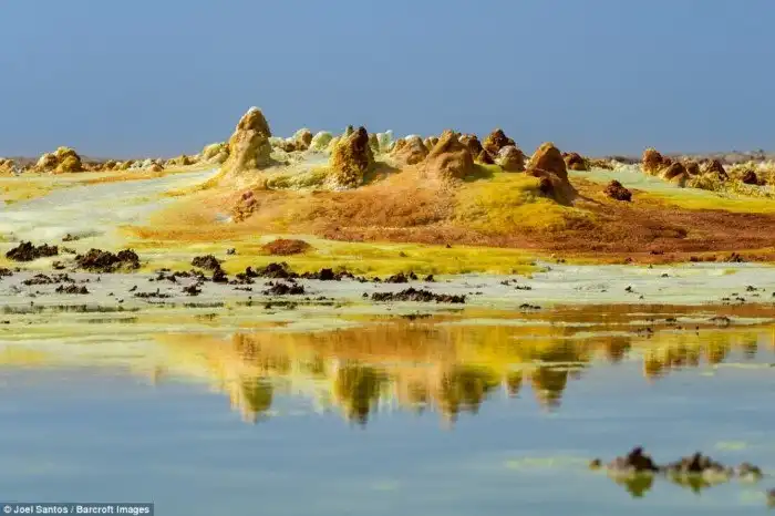 Суровые пейзажи включают действующие вулканы, дурно пахнущие сероводородные горячие источники, черные ручьи лавы и усыпанные соляными кристаллами водоемы.