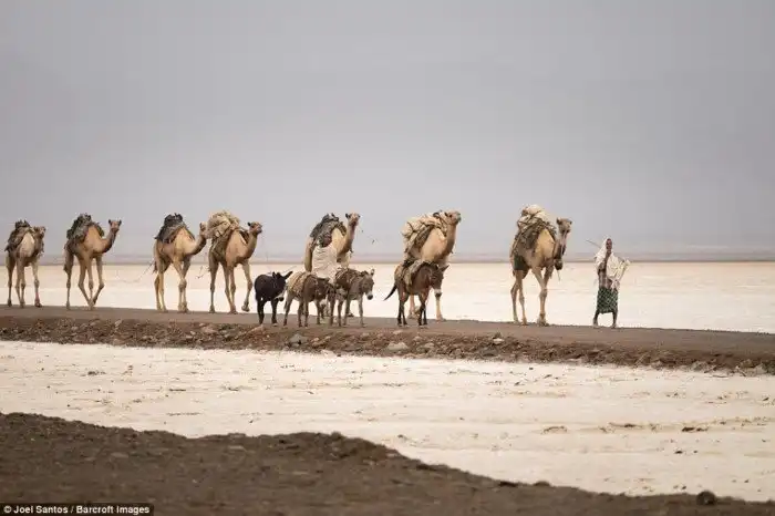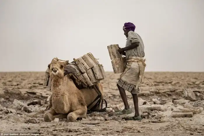 Когда-то соляные блоки использовались в этой местности как валюта, однако теперь им на смену пришли деньги, как и во всем остальном мире. Местное афарское население имеет строгую монополию на впадину Данакиль и ревностно охраняет соль. Каждый торговец, прежде чем проехать, должен остановиться у хижины сборщика соляной пошлины и заплатить за каждого верблюда, осла и мула в своем караване.