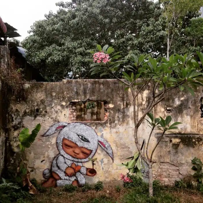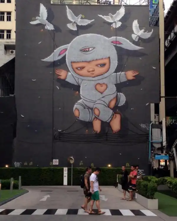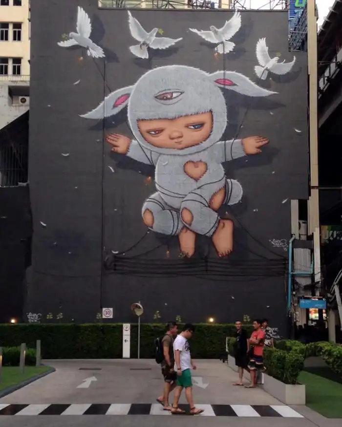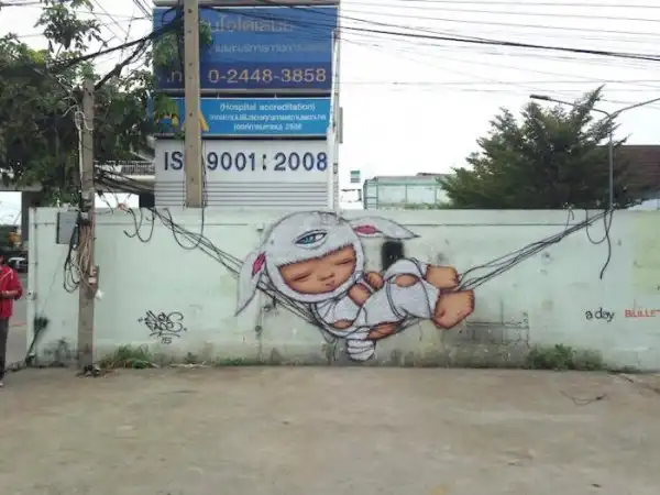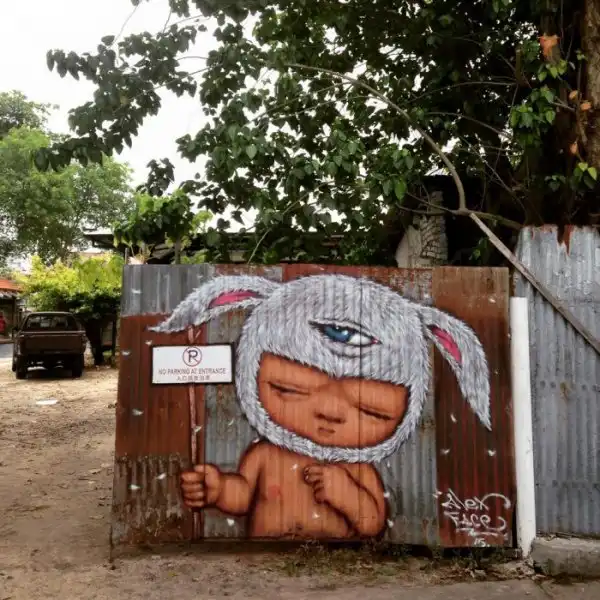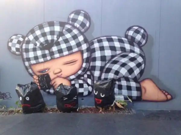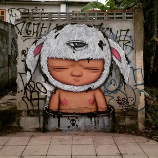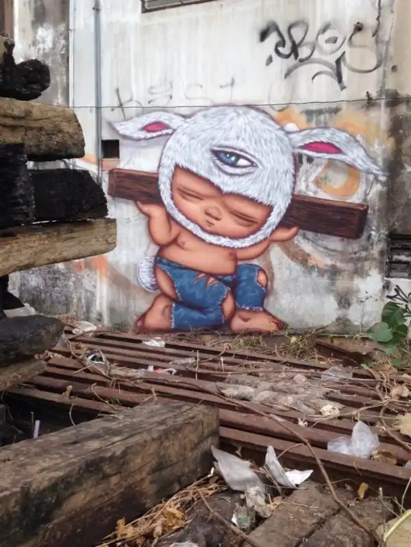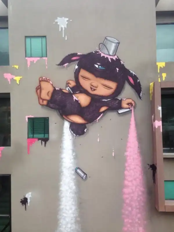 Одна из изюминок уличных рисунков этого автора – вы не всегда сможете понять, где рисунок начинается и где заканчивается. Alex Face считает это очень важным моментом. Интеграция в нашей жизни имеет большое значение и уличное искусство не должно быть исключением. Гармоничное сочетание стрит-арта с общей городской картинкой – лучшее, что можно придумать в качестве похвалы самому себе. На всех рисунках Alex Face присутствует малыш с тремя глазами: «Это душа. Мы все чувствуем с самого рождения и не признавать такие очевидные вещи было бы глупо».