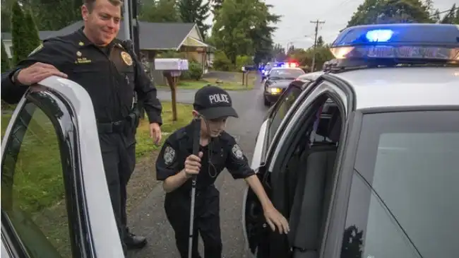 Кейдж Хэнкок-Стивенс всегда хотел быть полицейским, но, к сожалению, он полностью слепой. Сотрудники полиции решили сделать ему сюрприз и взяли с собой в патруль.