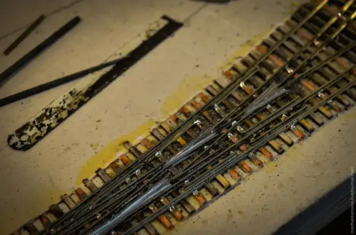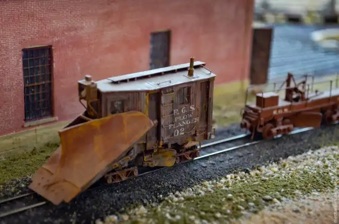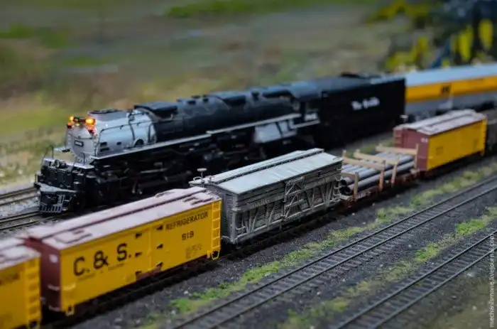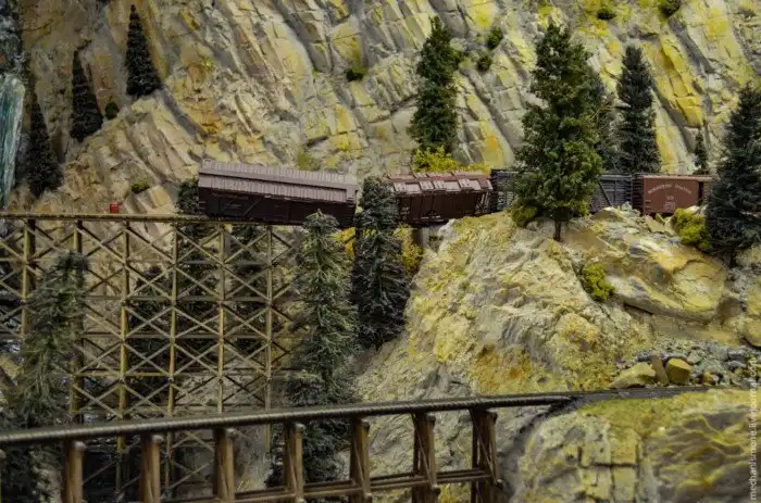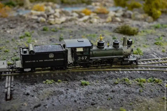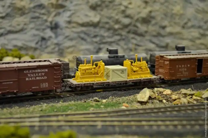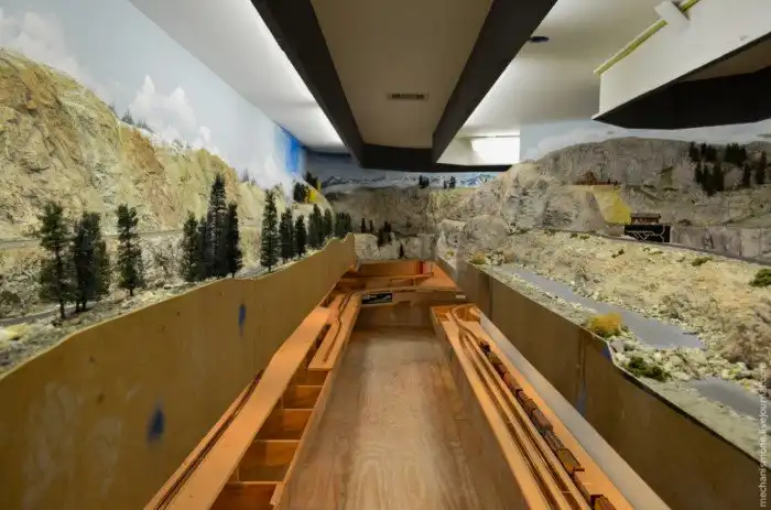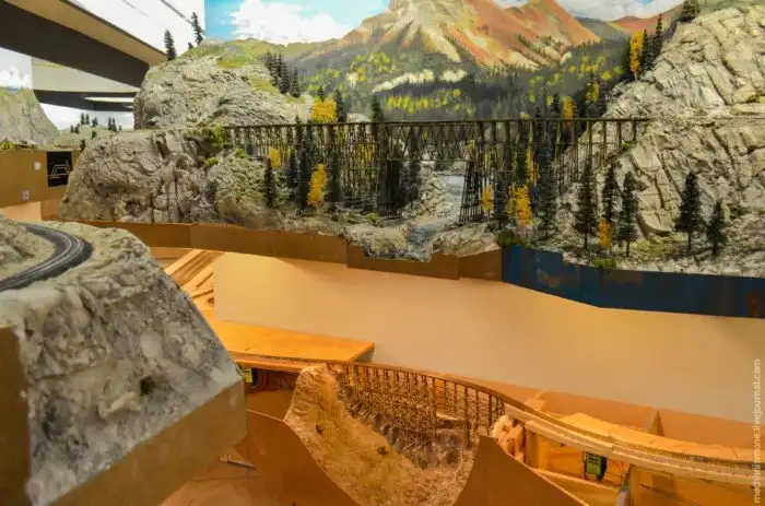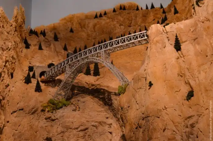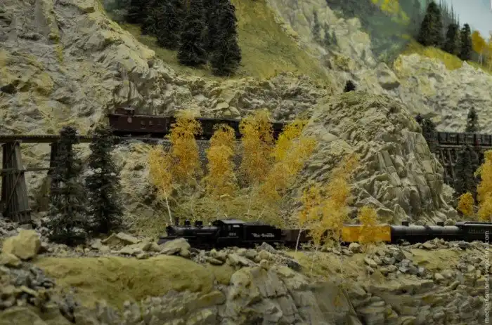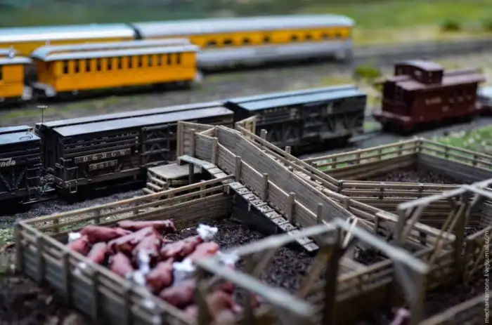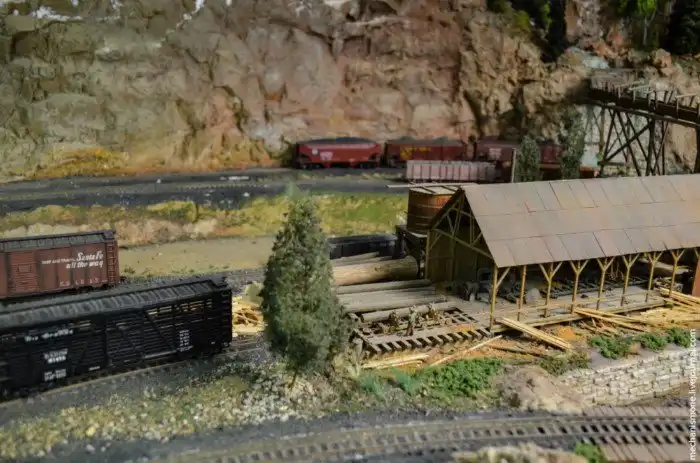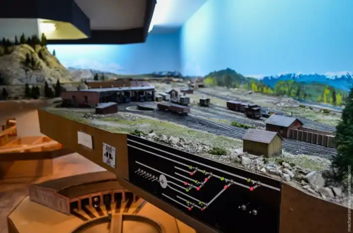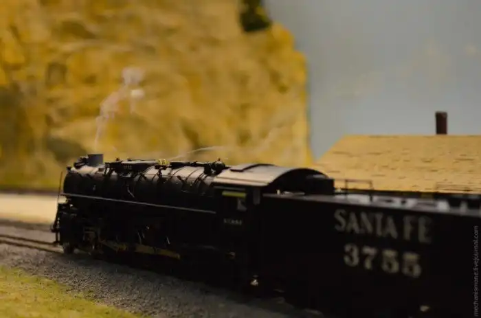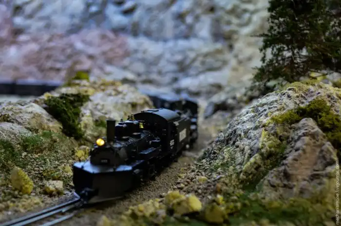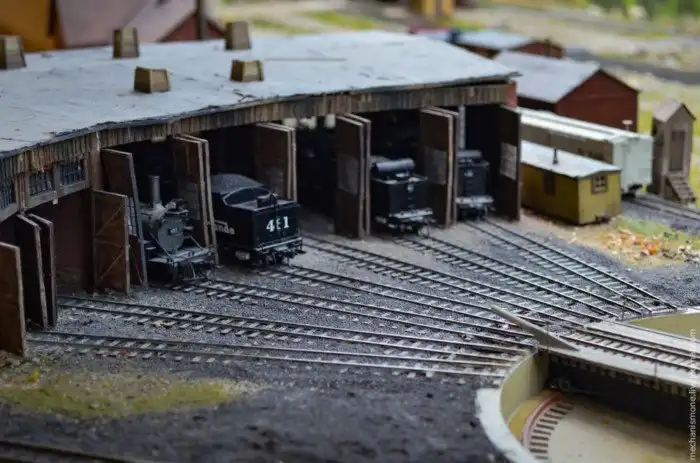 Почти все декорации сделаны вручную самостоятельно, из покупного здесь лишь вагоны, материал и тепловозы с паровозами.