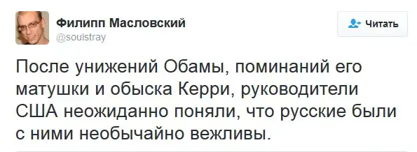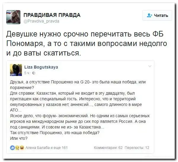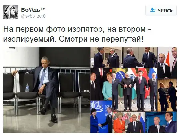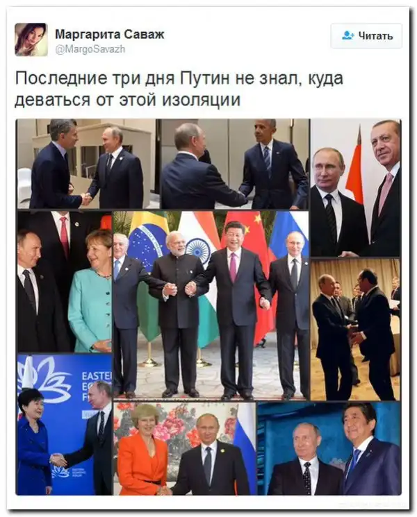 Не понимаю этих восторгов по поводу G20, как там нашему солнцеликому все руки жмут, мол перемога, неизоляция. А по сути? Санкции сняли? - нет, ввели новые, при этом так же подходили мол мы не хотим, но нас заставили и т.д. Нам от этого легче? США с их базами и ПРО со своих территорий выгнали? - нет, но так же подходят, руку жмут. По своим центральным СМИ убрали откровенно лживые и провокационные обвинения в нашу сторону? - нет.