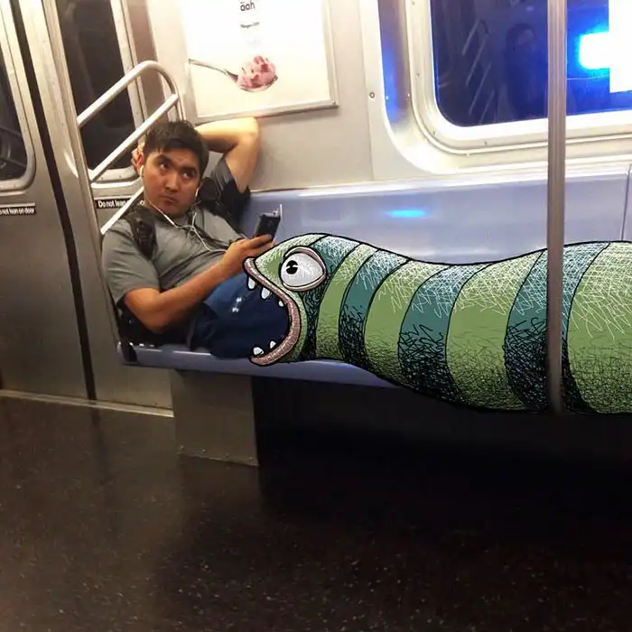 Каждый день художник Бен Рубин отправляется на работу на метро. Он едет из Бруклина в свой офис на Манхэттене, и по пути, чтобы не скучать, создает смешные картинки, подрисовывая к ничего не подозревающим пассажирам разнообразных монстров, уродцев и страшилок. Свои творения он публикует в социальных сетях, - и, наверное, не один пассажир, узнав себя на картинке, с дрожью пообещал себе больше никогда не спать в метро...