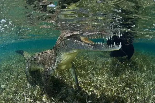 Эти удивительные кадры показывают, как проходит фотосъемка крокодилов в их привычной среде обитания у берегов Белиза. Мексиканский подводный фотограф Rodrigo Friscione очень близко подплывает к огромным хищникам, а они как буд-то позируют перед камерой, иногда даже касаются ее мордой.