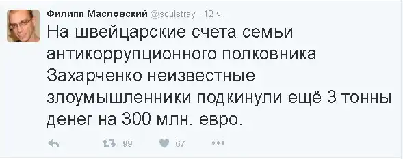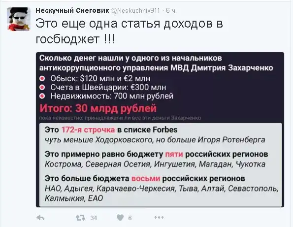 Это фигня, полковник. Там таких полковников... Вот когда верховного главнокомандющего встряхнут за шкирку - удивитесь, сколько миллиардов посыплется. Не то что Россию с колен поднять - десять таких Россий построить хватит.