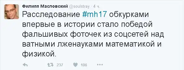 Но это то полдела. Потом же целый спектакль начался (и продолжается) по забалтыванию вопроса, вместо его прояснения. То по экспертам МАКа начинают стрелять "украинские силовики" в глухом тылу ДНР, причем с миномета малого калибра, откуда-то из соседних кустов, и аккурат так, чтобы самих экспертов не задеть. То кремлевская пропаганда фотошопы с американских блогов начинает выдавать за доподлинные спутниковые снимки с Су-27. Потом сливается. За ней начинается выступление Минобороны РФ, у которых Су-25 внезапно начинают летать на 10.000м со скоростью, позволяющей боинги перехватывать. Эту туфту даже сейчас гонят. Может достигать 10000м и разгоняться до 700кмч. Не упоминая, что это взаимоисключающие параметры, на 10.000м у него скорость не выше 450кмч (боинг мимо него просвистит на 500кмч как рядом со стоячим и уйдет в точку к горизонту) и режим близкий к сваливанию. А 700кмч Су-25 достигает исключительно в пикировании, потом начинается флаттер и самолет просто разорвет на куски, если продолжить пикировать. Потом чехарда с показаниями радаров. Хрен с ним, что графики на брифинге - это картинка из корела, а не скрин с программ отображения первичной радиолокационной обстановки. На первом брифинге Су-25 там был. На втором, тоже с картинками - его уже не было (неделю назад). И МОРФ утверждало - никто там не летал, вон смотрите, боинг в чистом небе. Журналисты уличили МОРФ во лжи - тут же начались оправдания.