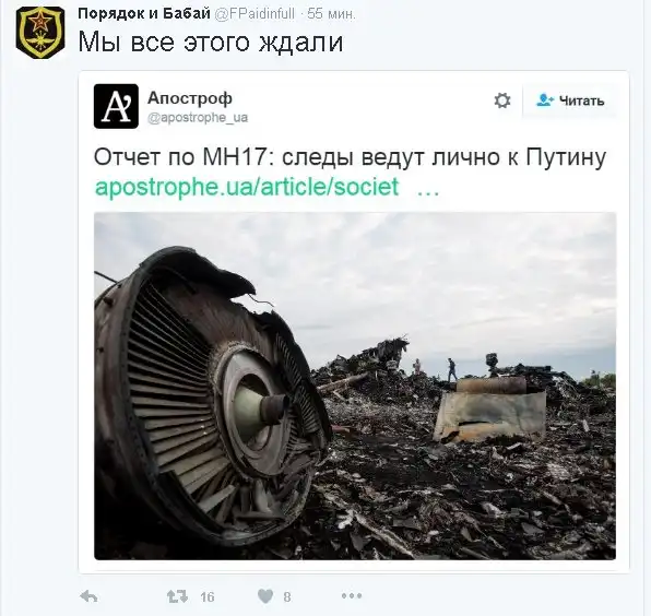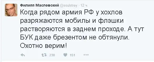 Допустим Россия сбила самолет. Почему Украина не дает запись разговоров диспетчеров ? Почему расследование до сих пор не опубликовало все доказательство ? Зачем продлевать расследование ? Почему хваленые пиндосы не показали хоть одно фото с развед спутников ? У них ими весь мир покрыт ! Почему это расследование постоянно откладывается ? Почему в предварительных результатах Бук тащили крюком, а не напрямую через луганск ? И как это у хохлов нет Буков, если они на своем параде их с десяток вывели ? Неужто на фоне всех санкций к России, одна страна следователь продалась ?