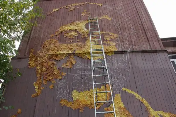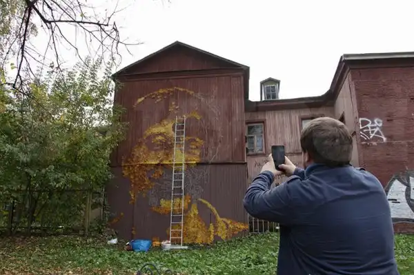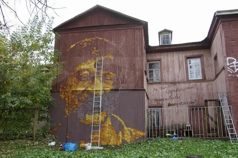 Кленовые листья различных оттенков собрали за полдня. Сообщается, что портрет расположен на доме рядом с корпусом Дягилевской гимназии, на стенах которой художнику запретили рисовать портрет русского театрального деятеля Сергея Дягилева.