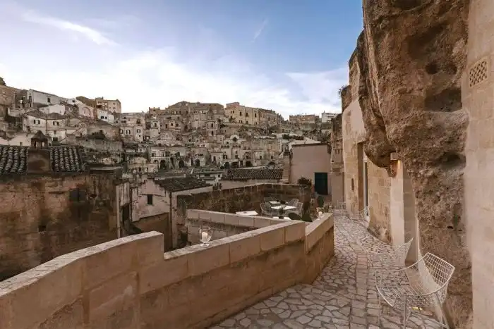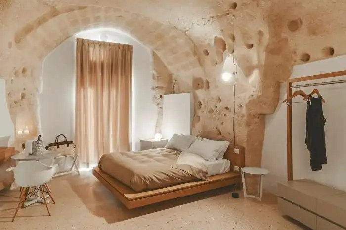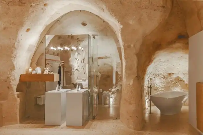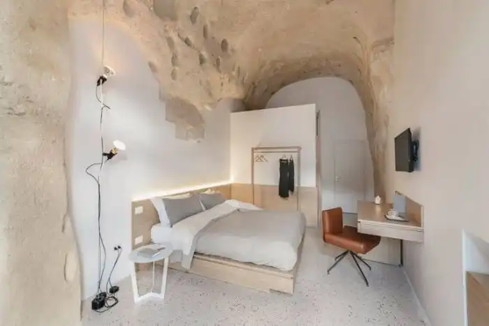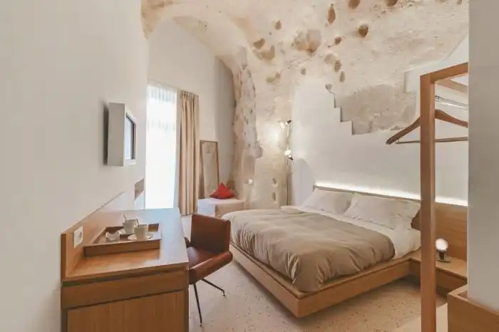 В итальянском городе Матера находится уникальный отель La Dimora di Metello, который выбит в скале. На протяжении веков жители этого региона строила дома в скалах, поэтому архитекторы отеля решили пойти по тому же пути. Относительно небольшая гостиница состоит из четырех люксовых номеров, террасы, просторного холла и СПА салона. Несмотря на то, что комнаты выбиты в скале, они очень светлые и уютные, к тому же в них есть все необходимое для максимального комфорта постояльцев.