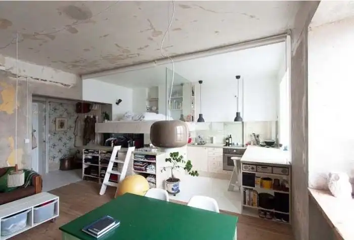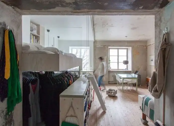Архитектор Карин Мац из Стокгольма превратила помещение площадью 36 квадратных метров из склада современную квартиру-студию. На половине этого пространства девушка уместила кухню спальню и гардероб. Работа над второй половиной жилья пока еще не завершена, но здесь Карин обустроит уютную зону отдыха.