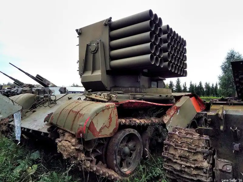 В общем, Импульс-Шторм сделан на базе Т-62 и представляет собой многофункциональную машину взрывного распыления материалов, предназначенную для тушения пожаров разных классов посредством залповой подачи огнетушащих составов на очаг возгорания.
