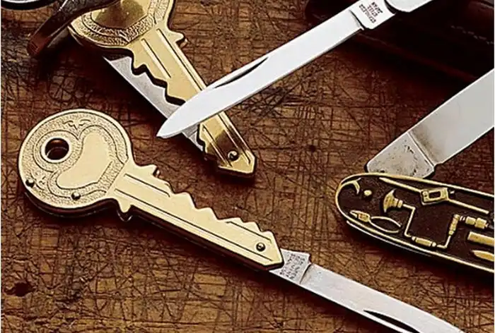 Напоследок вниманию читателей очередной нож для мастеров конспирации и скрытных операций по инфильтрации в свой собственный дом. Забавный перочинный нож, рукоятка которого выглядит, как ключ от двери.