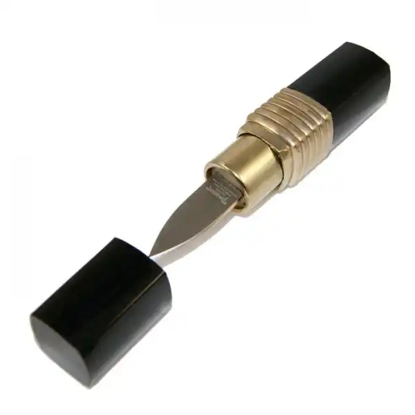 Нож невероятно популярный инструмент у любителей скрытых аксессуаров. Любопытным решением является вот этот ножик, который спрятан в женской помаде для губ. Интересность и занимательность идеи компенсируются почти бесполезной длиной лезвия.