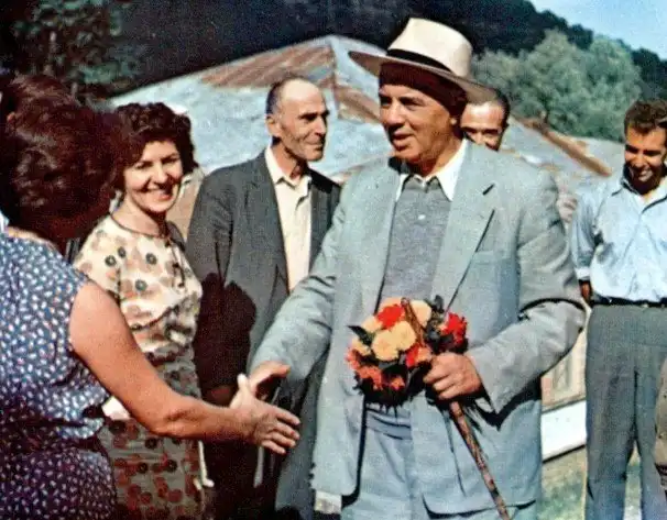Албанский вождь Энвер Ходжа (правил с 1944 по 1985 г.) во время визита в горной деревне Дарде в 1966 году: