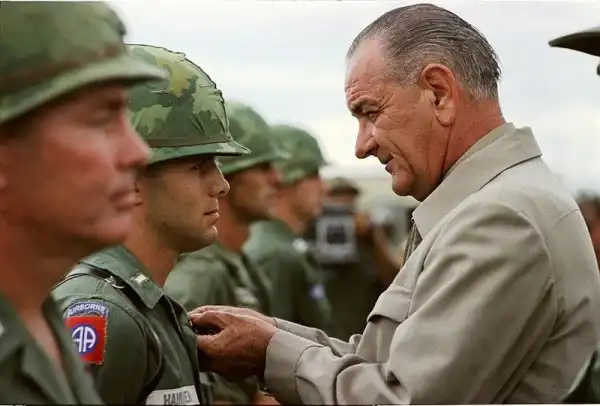 Президент Линдон Джонсон награждает американских солдат во время своего визита во Вьетнам, 1966: