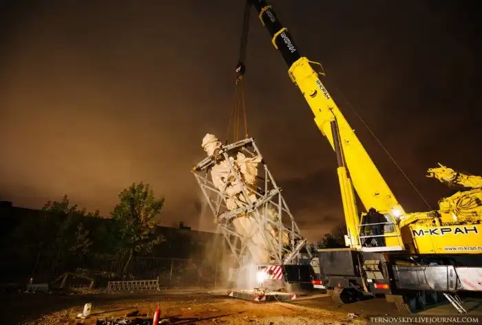 Сразу же началась погрузка памятника на 150-тонный тягач. Для этого всю конструкцию сначала положили на бок.