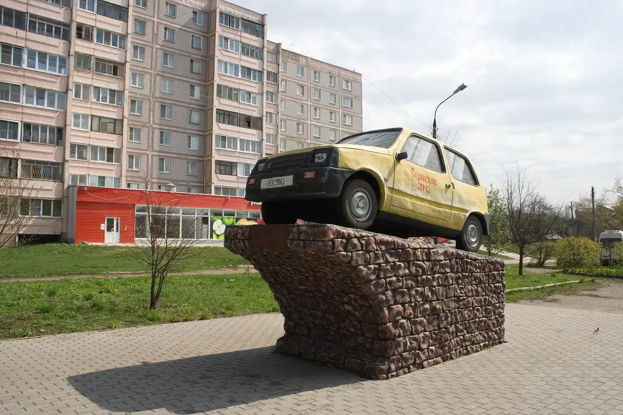 Этот необычный памятник установлен в подмосковном Серпухове, как раз напротив завода, где делали настоящие автомобили «Ока». Вот только непонятно почему вместо оригинального экземпляра понадобилось сооружать этот макет. Корпус или вернее сказать «скорлупа» сделана из некоего шершавого материала напоминающего стеклопластик.